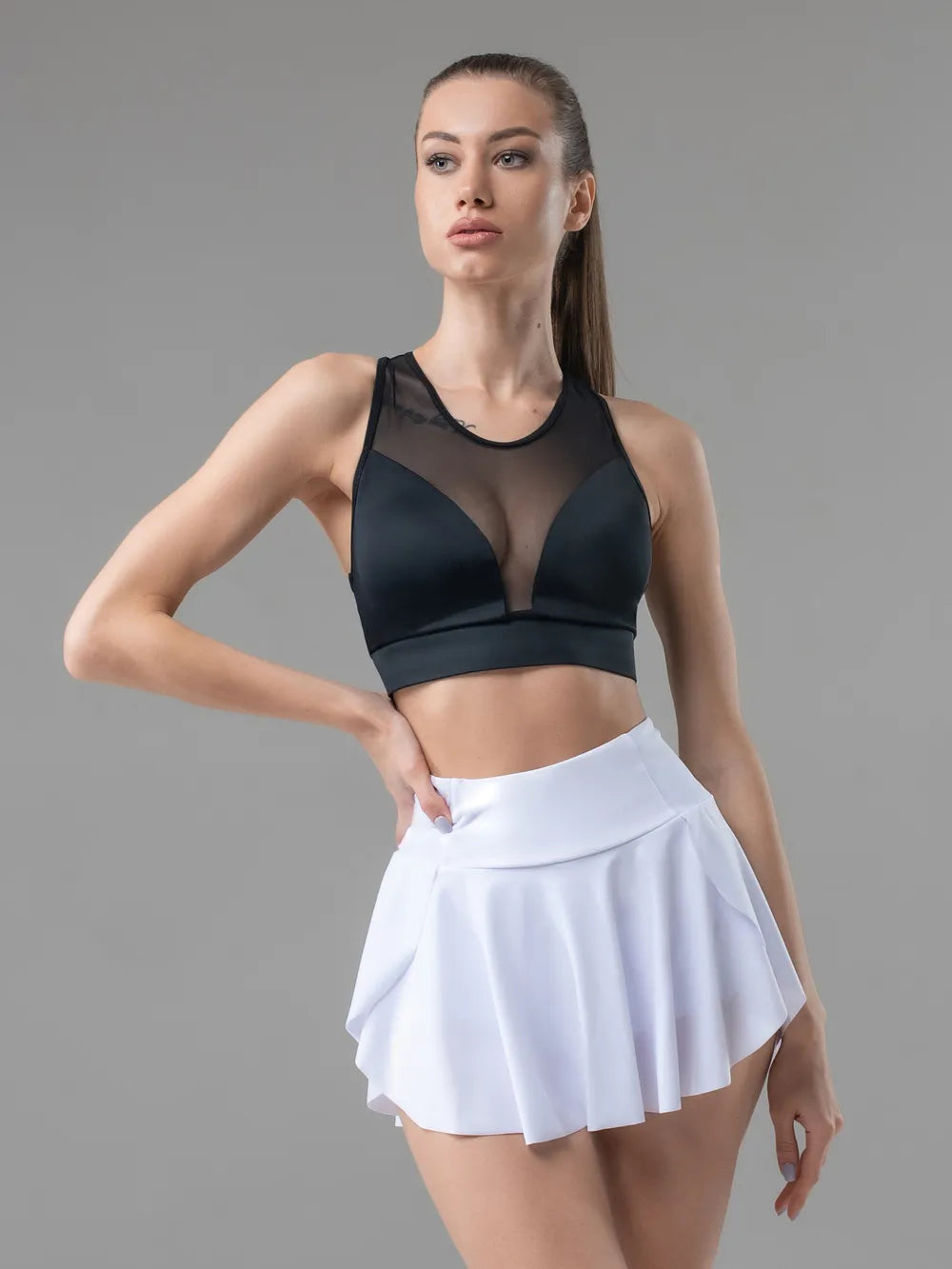 En universell sportstopp med bröststöd, tillverkad av tjock sportjersey och stretchstickad mesh. Den imiterade V-formade, genomskinliga halsringningen skapar ett förföriskt och sportigt utseende.